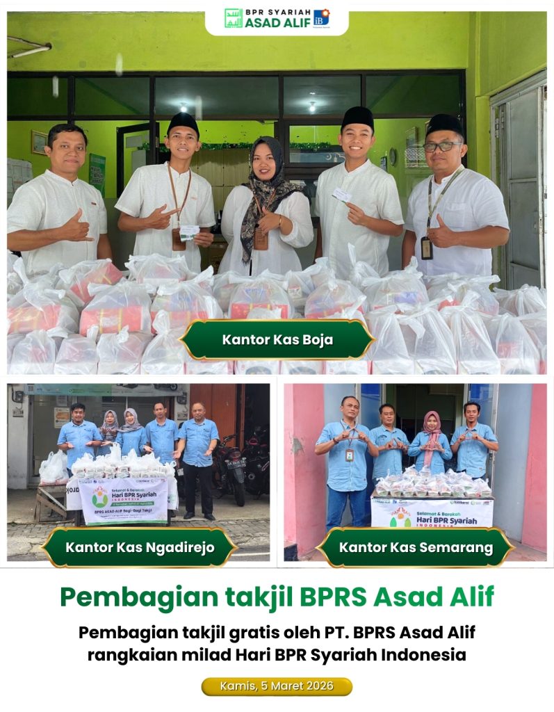 Dalam rangka memperingati Milad Hari BPR Syariah Indonesia, seluruh Kantor BPRS Asad Alif turut menyemarakkan momen penuh berkah ini dengan menggelar kegiatan pembagian takjil kepada masyarakat pada 5 Maret 2026. Kegiatan ini dilaksanakan secara serentak di beberapa kantor kas, yaitu Semarang, Boja, dan Ngadirejo, sebagai wujud kepedulian serta semangat berbagi kepada masyarakat yang sedang menjalankan ibadah puasa Ramadan. Melalui kegiatan ini, BPRS Asad Alif berharap dapat semakin mendekatkan diri dengan masyarakat, menebarkan kebaikan, serta memperkuat nilai kebersamaan dan keberkahan di bulan suci. Semoga semangat berbagi ini menjadi bagian dari upaya menghadirkan perbankan syariah yang bermanfaat, amanah, dan terus bertumbuh bersama umat.