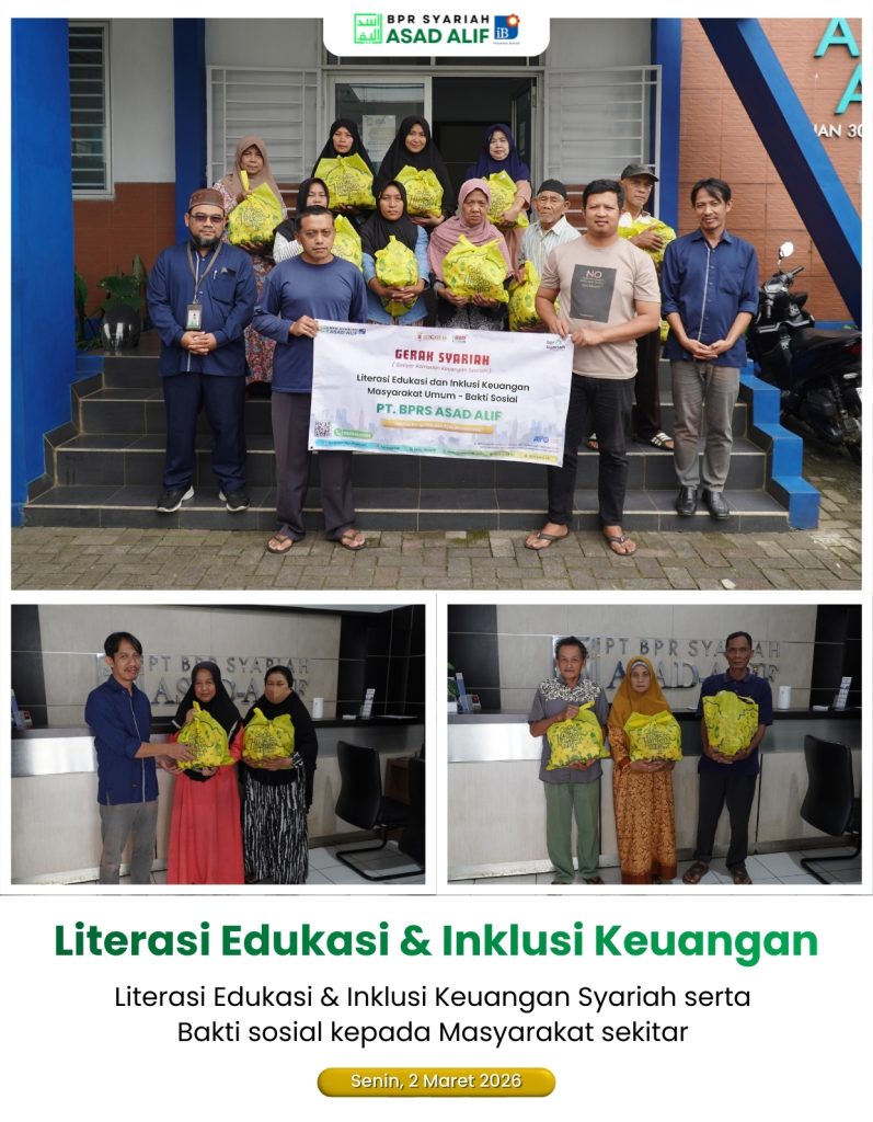 Assalamualaikum warahmatullahi wabarakatuh Alhamdulillah pada senin 2 maret 2026 kami telah melaksanakan kegiatan edukasi dan inklusi keuangan serta bakti sosial di lingkungan sekitar kantor. Kegiatan ini merupakan bagian dari partisipasi aktif BPRS Asad Alif dalam kampanye nasional Gerak Syariah, yang bertujuan meningkatkan literasi dan inklusi keuangan syariah sekaligus memperkuat peran lembaga keuangan syariah dalam pembangunan sosial masyarakat. “Melalui kegiatan ini, kami ingin menegaskan bahwa keuangan syariah tidak hanya berorientasi pada aspek bisnis, tetapi juga memiliki tanggung jawab sosial. Pembagian sembako ini adalah bentuk kepedulian sekaligus penguatan hubungan antara BPRS Asad Alif dan masyarakat sekitar. Program ini dilatarbelakangi oleh semangat untuk memperkuat solidaritas sosial serta memperluas pemahaman masyarakat terhadap peran dan manfaat layanan keuangan syariah. Dengan memadukan edukasi dan aksi sosial, Kami...