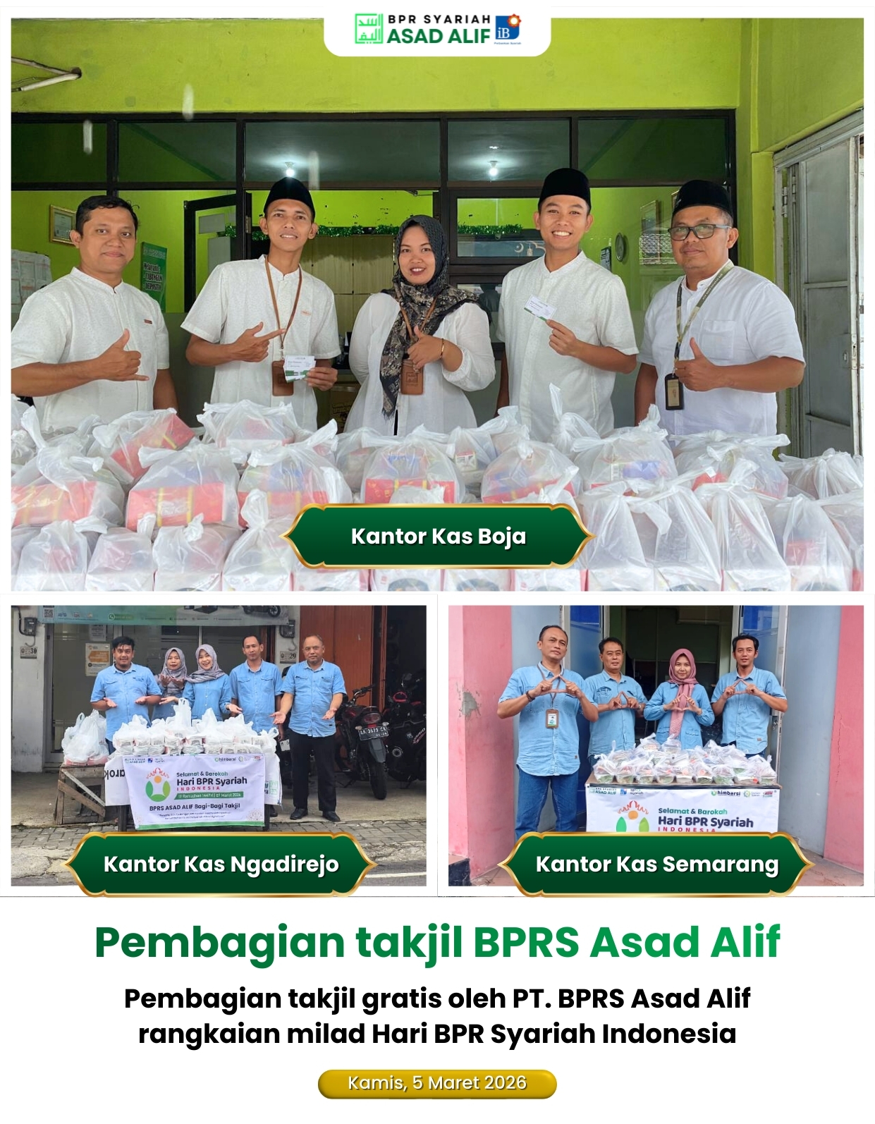 Dalam rangka memperingati Milad Hari BPR Syariah Indonesia, seluruh Kantor BPRS Asad Alif turut menyemarakkan momen penuh berkah ini dengan menggelar kegiatan pembagian takjil kepada masyarakat pada 5 Maret 2026.
